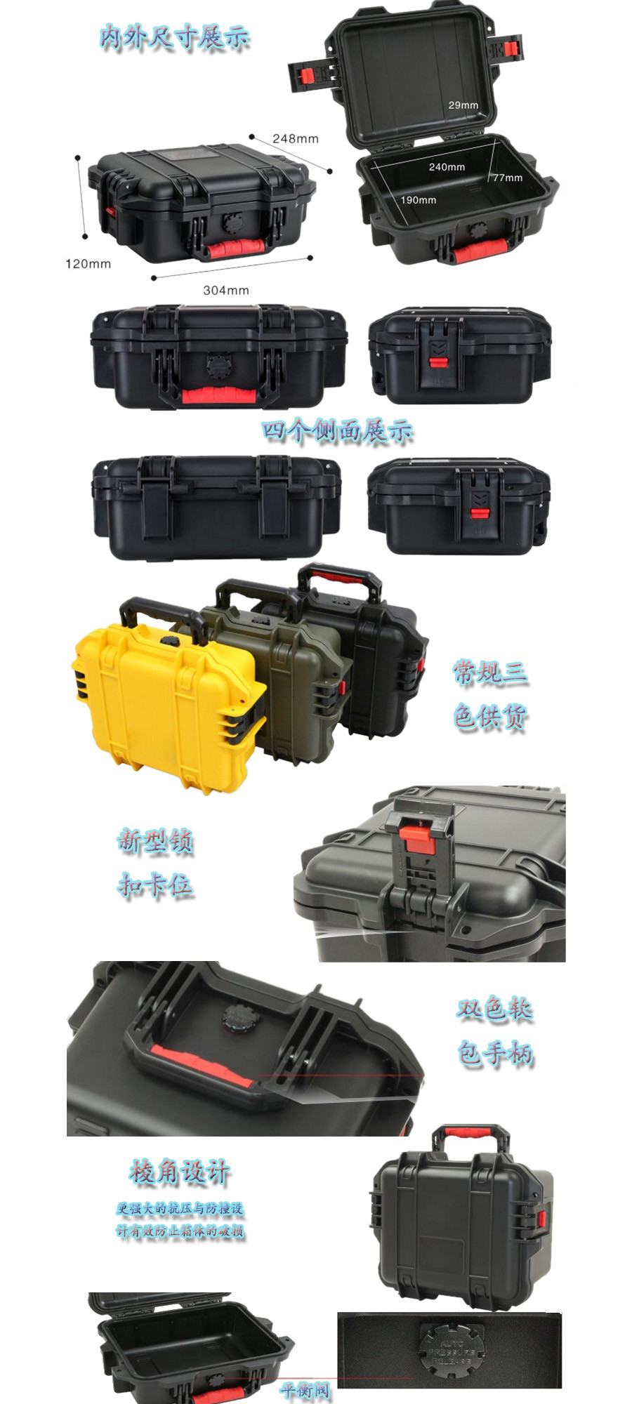 簡要說明:廣泛用于傳媒、公安、消防、軍隊、航空、戶外攝影、野外考察、科學(xué)探測等眾多領(lǐng)域的高端儀器、儀表。具有高強(qiáng)度、高抗壓沖擊、防潮、絕對密封、防塵、防水等特點(diǎn)。產(chǎn)品材質(zhì):ABS原料,箱體采用高抗沖擊的高分子聚合材料一體注塑成型,密封采用扁型彈性發(fā)泡密封橡膠條,確保防水氣密,所有較軸均采用不銹鋼材質(zhì)。